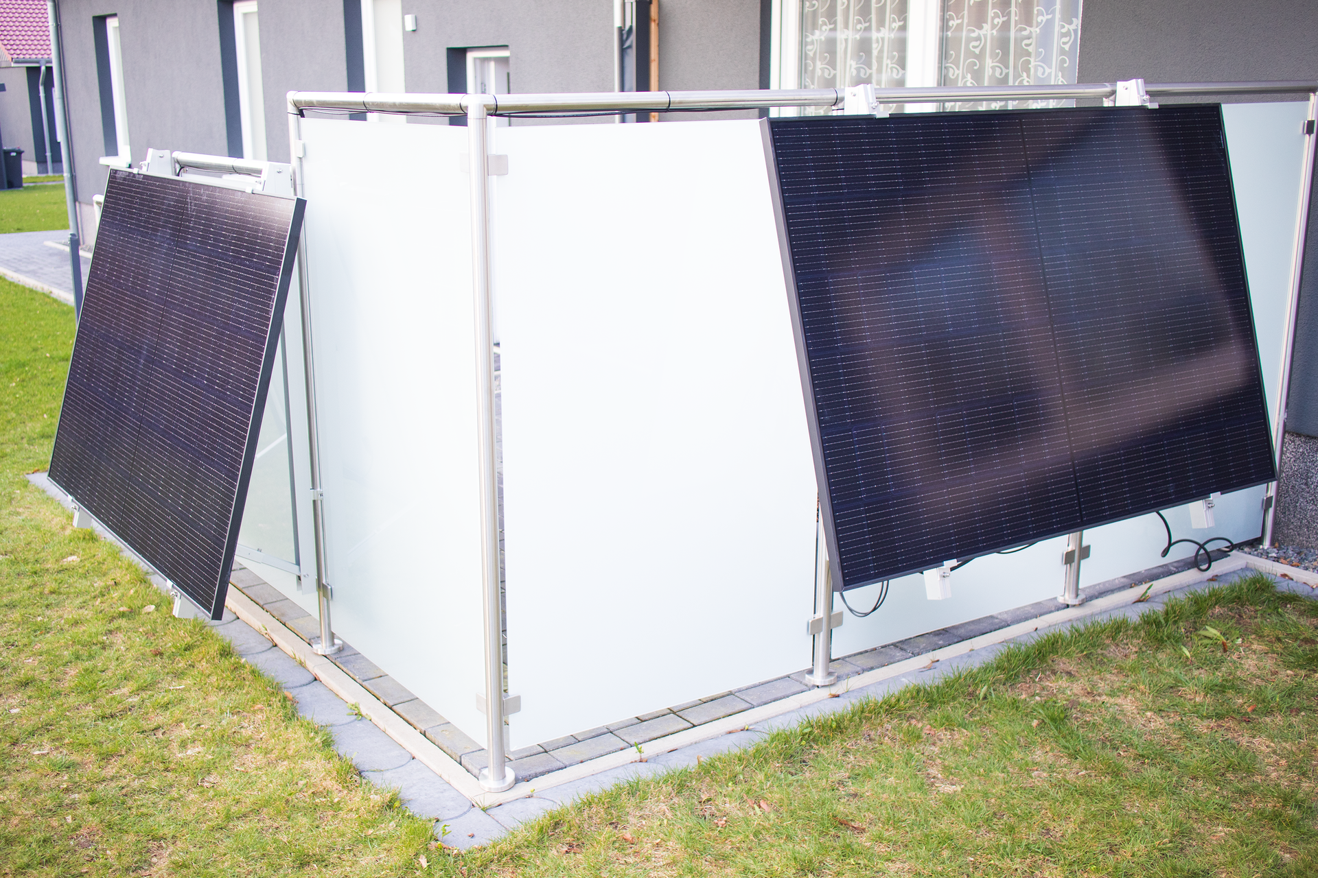Wir haben eins unserer Minikraftwerke mit Hilfe von Half Coupler an ein Edelstahlgestell montiert. Half Coupler kennt man aus der Bühnentechnik. Die Schellen gibt es mit unterschiedlicher Weite. In unserem Fall haben wir welche genutzt, die für einen Rohrdurchmesser von 38-41mm geeignet sind. Unsere Halterungen sind im Winkel einstellbar. Somit ist es natürlich ein Leichtes den Ertrag etwas nach oben zu schrauben. Die Panels werden anschließend mittels Endklemmen auf die Schienen der Halterungen geschraubt. Den Wechselrichter haben wir ebenfalls an einer der Halterungen befestigt. Nach gut einer Stunde Arbeit und anschließendem Verbinden aller Steckverbindungen, konnte das Balkonkraftwerk auch schon in Betrieb genommen werden. Zum Schluss zeigte sich die Sonne nochmal kurz - Die Grundlast war gedeckt - Und der Kunde war glücklich!